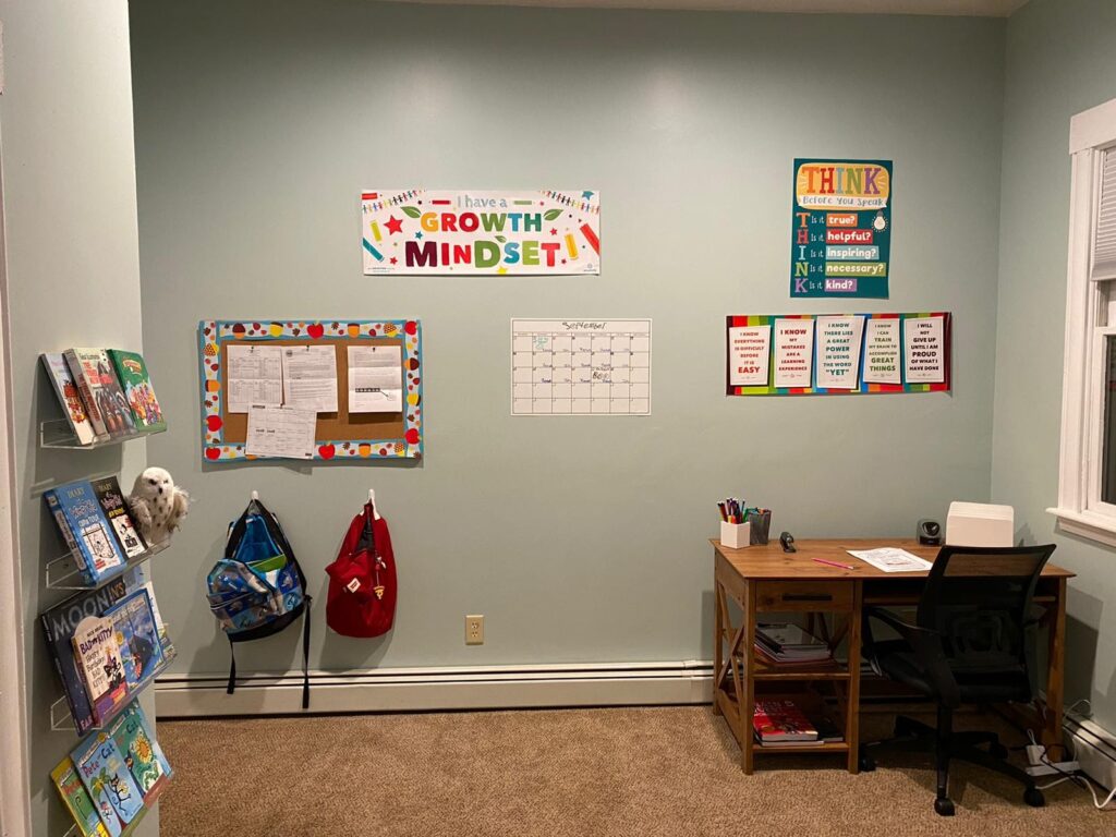 Not pictured: the other side of the room with some bean bags, another desk, and a tent set up as a “calming station” for the younger of the two nephews.