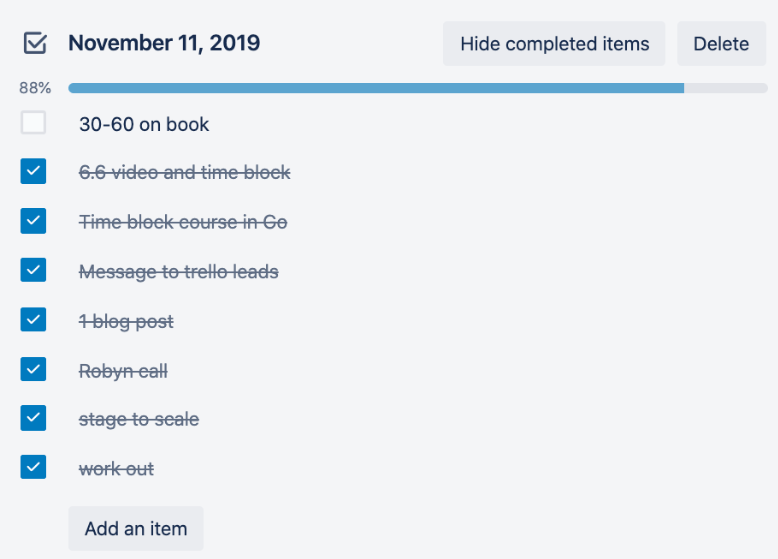 *Note: The Trello card above represent tasks aligned to my OKRs (or most important goals). This is not everything I do in a given day. Keeping track of that would be a waste of time. The goal is to focus on deep work.