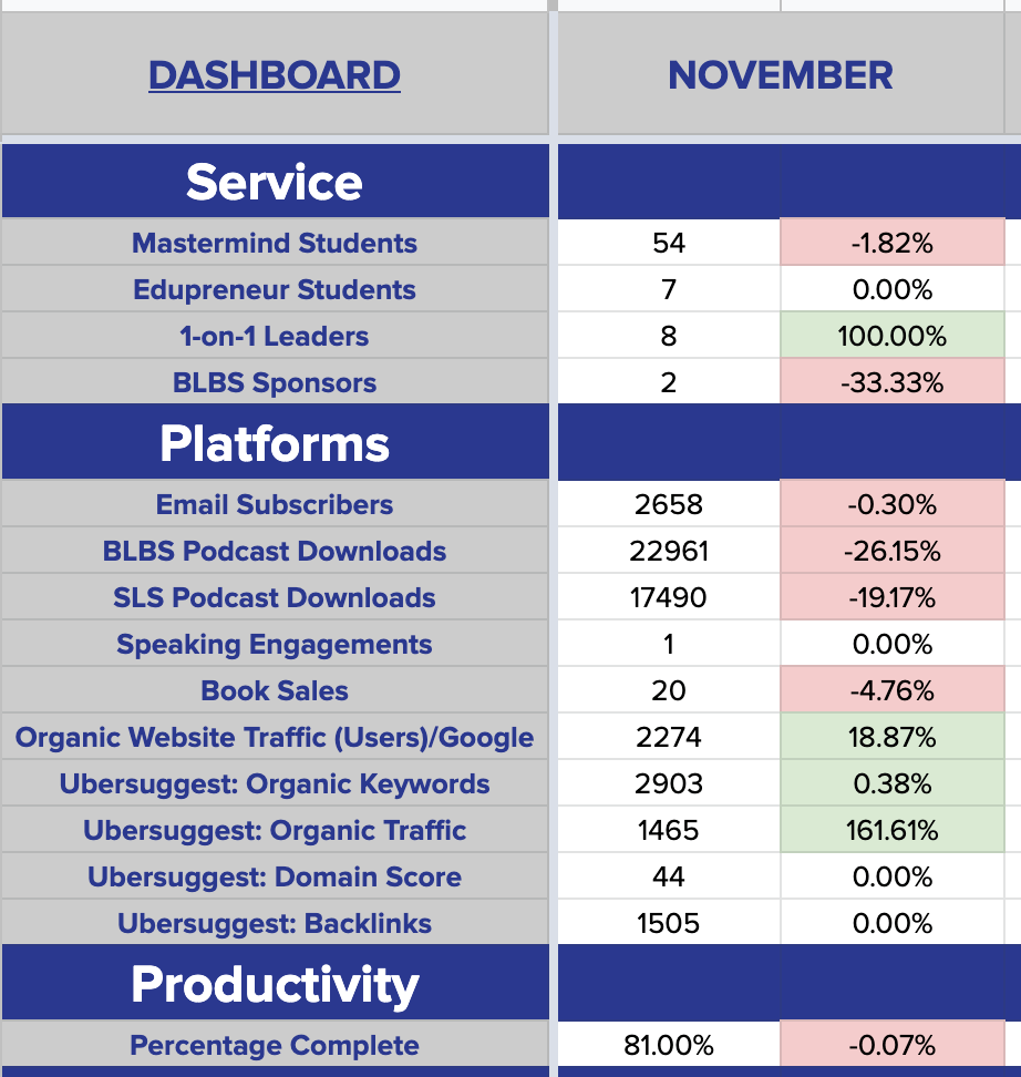 For the past two years, I have used a dashboard to keep track of important metrics aligned with my goals. These metrics were broken into the following categories: Students, Platforms, Productivity, and Finances. I write a monthly post in public to hold myself accountable for updating the dashboard and do what is in my control to move things forward.