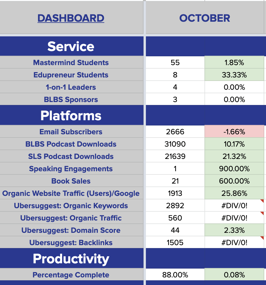 Each month I update my dashboard to make sure I am moving forward on important metrics. I care about the leaders I have the privilege to serve and the brand awareness that amplifies the signal I’m putting into the universe.